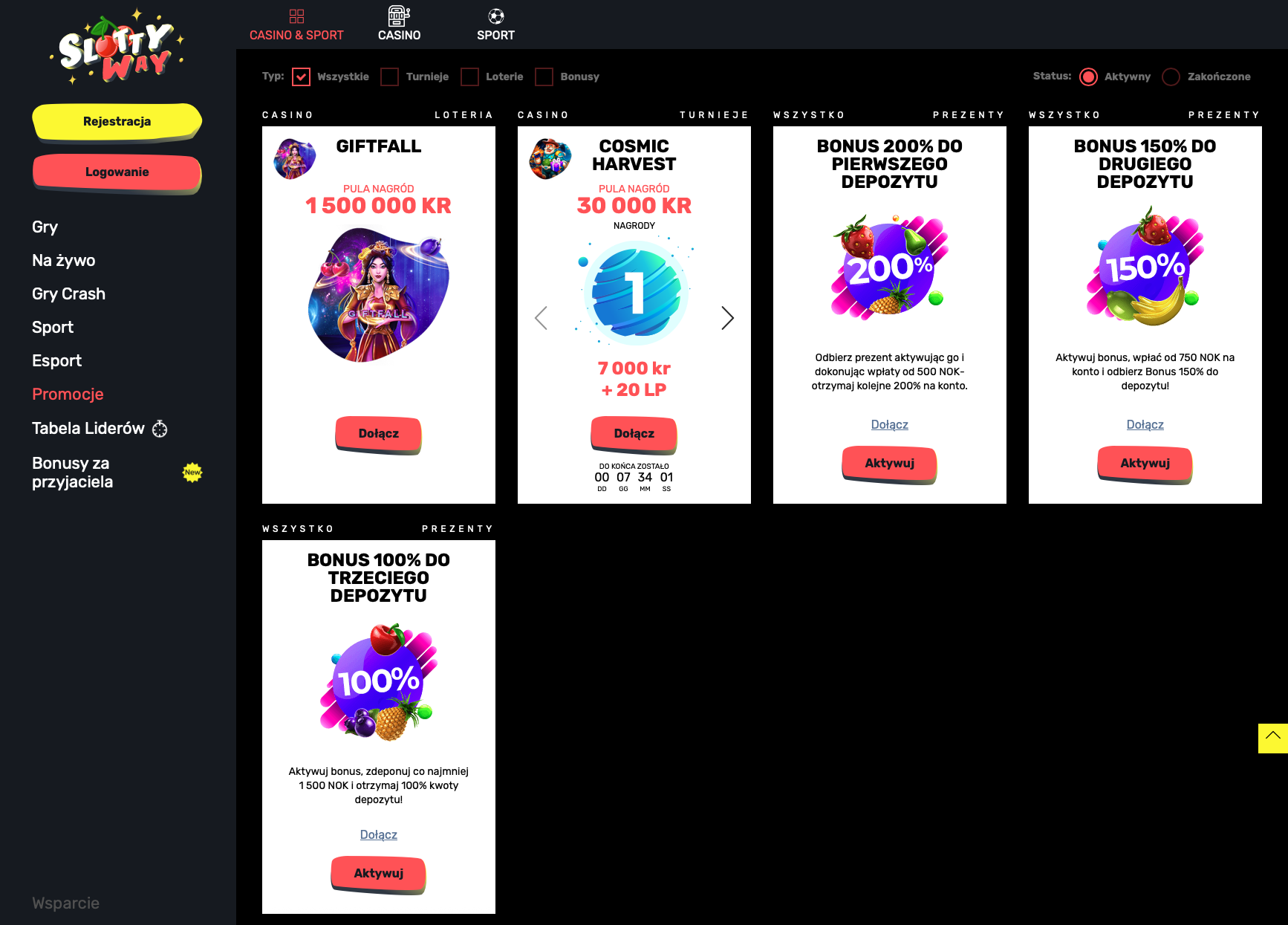 Warto regularnie zaglądać do sekcji „Promocje”, ponieważ Slottyway Casino często aktualizuje swoje oferty. Promocje mogą obowiązywać przez krótki czas – niekiedy tylko przez jeden dzień – dlatego istotne jest bieżące śledzenie informacji na stronie kasyna. Podobnie jak w przypadku bonusów bez depozytu, większość tych ofert aktywuje się bez potrzeby wpisywania Slottyway Casino kod bonusowy.