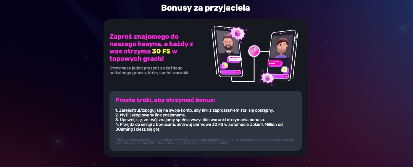 - 30 darmowych spinów za polecenie znajomego – bonus przypisywany po spełnieniu warunków przez zaproszoną osobę.