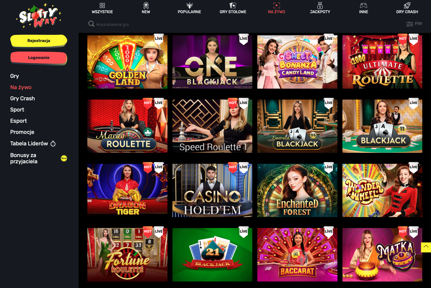 Dla osób szukających wrażeń zbliżonych do gry w kasynie stacjonarnym, Slottyway Casino oferuje kasyno na żywo z ponad 300 stołami prowadzonymi przez krupierów. Większość stołów pochodzi od renomowanych dostawców, takich jak Evolution Gaming i Ezugi.