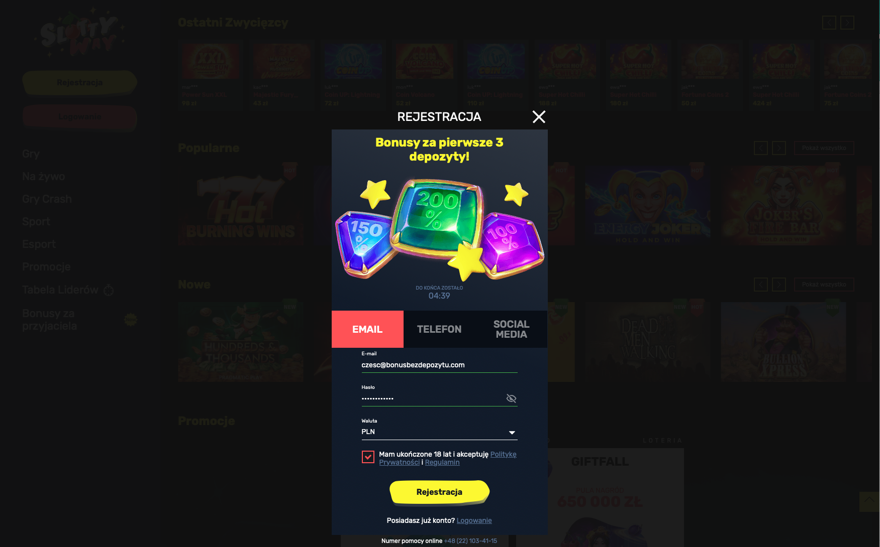 Na tym etapie nie ma konieczności przesyłania żadnych dokumentów – weryfikacja odbywa się dopiero przy wypłacie środków. Dla wielu graczy to duża zaleta, ponieważ umożliwia szybkie rozpoczęcie gry, zwłaszcza jeśli planują skorzystać z oferty Slottyway Casino no deposit bonus.